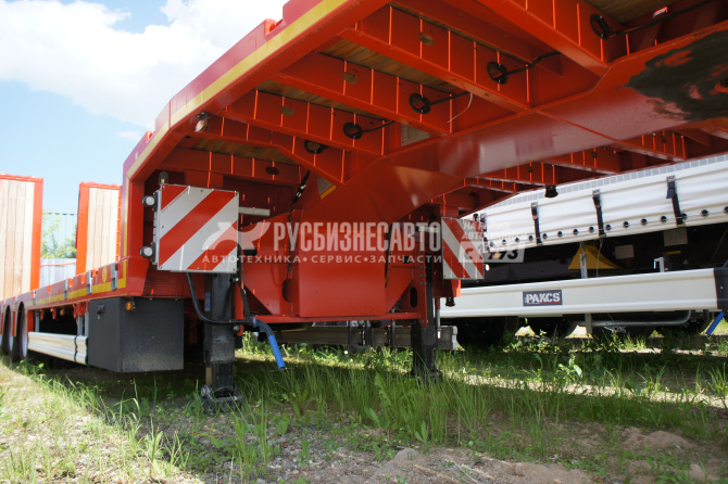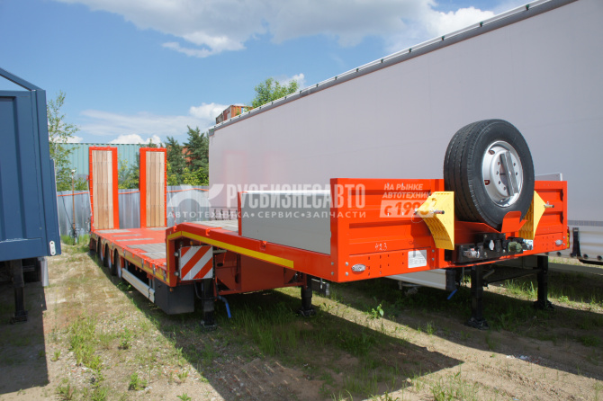 Низкорамный трал ISO PAKCS LOWBED трал 3 оси радвижной с уголом заезда 9 градусов, 1-я ось подъемная, 3-я подруливающая, оси BPW 10 т. пневмоподвеска с барабанными тормозами, максимальная полная масса 52 800 кг (при скорости движения 60 км/ч), 48 000 кг (при скорости движения 80 км/ч), 9240 мм + 6200 мм раздвижение с фиксацией каждые 500 мм, ширина общая 2 550 + 600 (уширители с фиксацией каждые 100 мм), гидравлические аппарели двойного сложения, собственная гидростанция с работой от АКБ тягача, отверстия для коников,  контейнерные замки для перевозки контейнеров 20 ft, 30 ft, 40 ft, двойной инструментальный ящик с ПВХ покрытием.