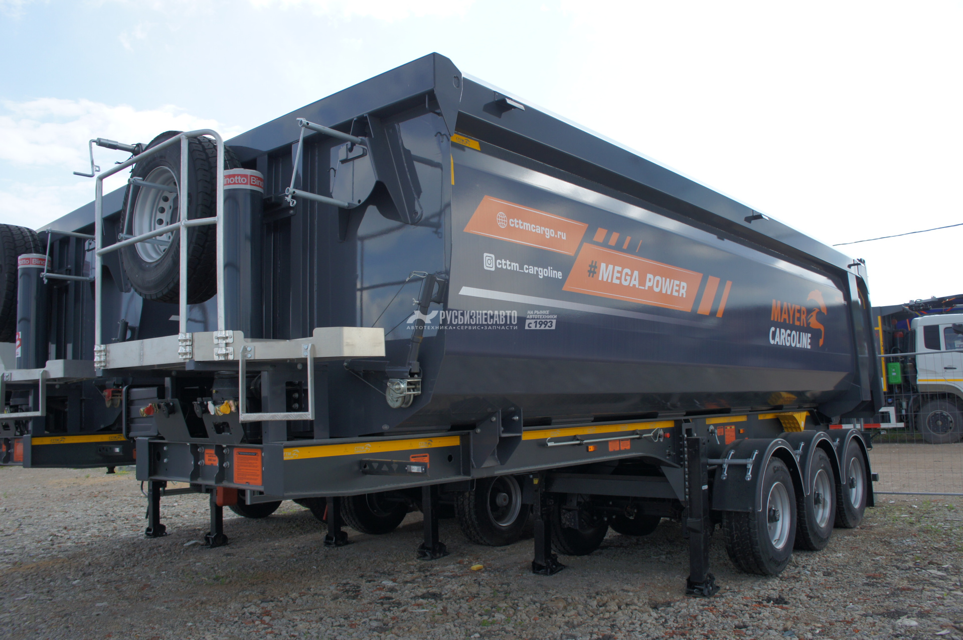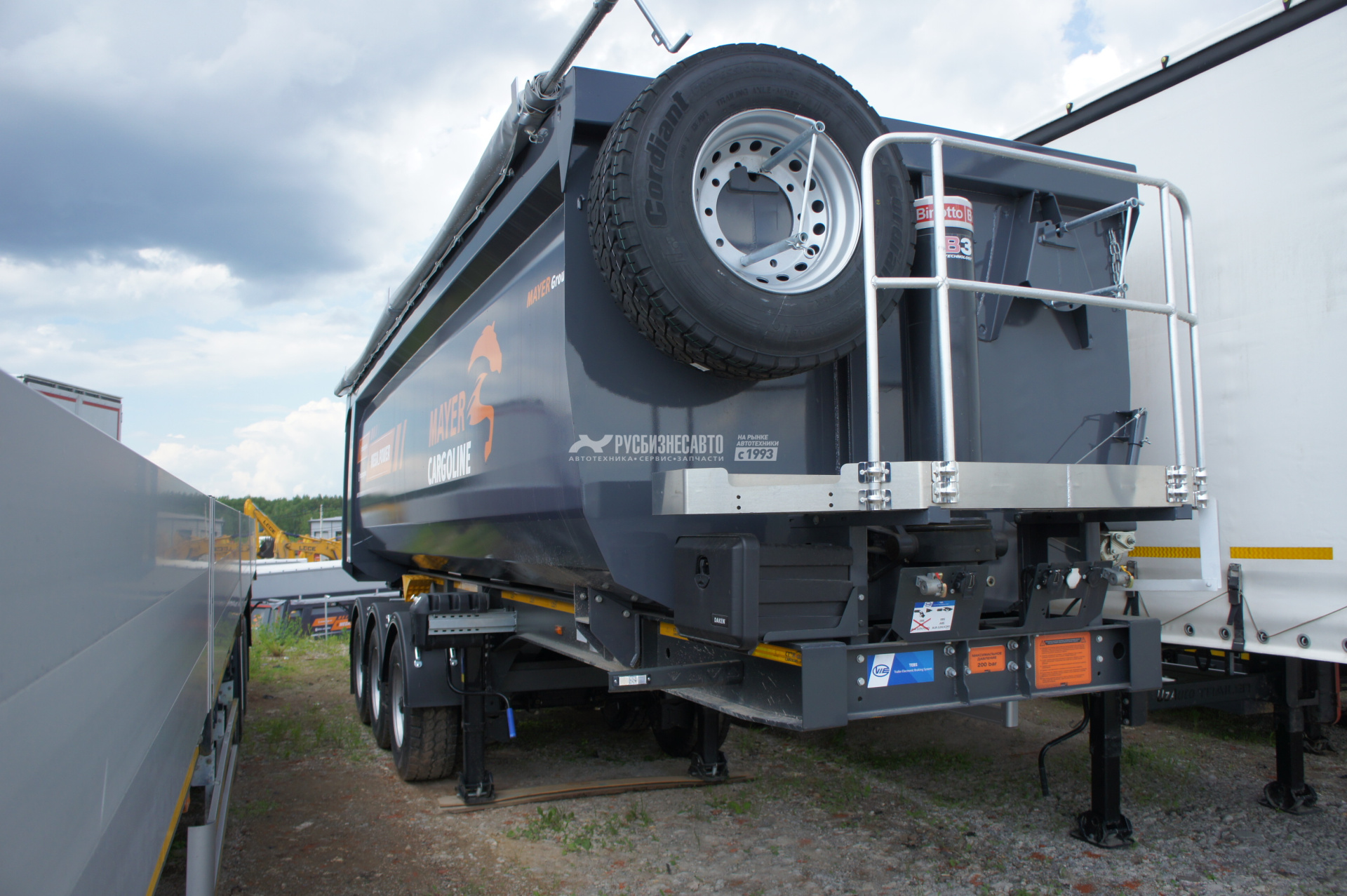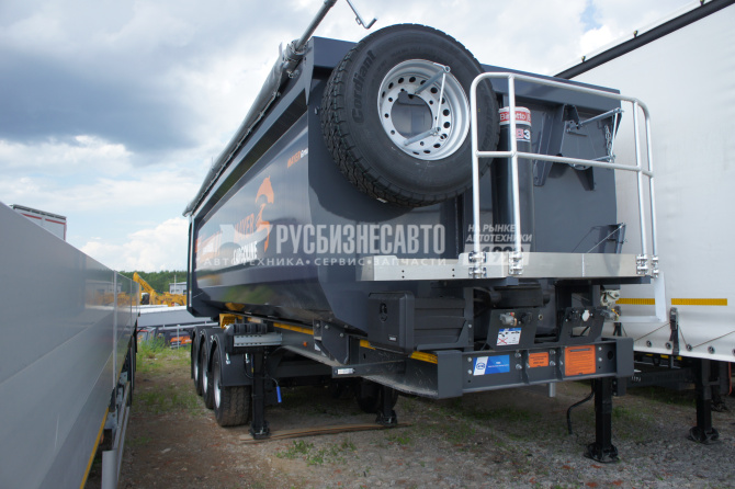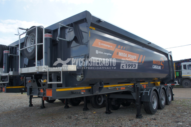 Cамосвальный стальной полуприцеп MAYER 962200 объемом 34 м3, ССУ 1200, З оси грузоподъемностью 10500 - 11500 кг- Ceylan, барабанные тормоза, передняя подъемная ось, грузовой отсек изготовлен из листового металла HB 450 S6 стены – 5 мм, пол – 6 мм, передняя стенка прямая сталь HB 450 - 5 мм, задний затвор - откидной борт,толщина полки рамы - 16 мм, шины 385/65 R 22,5, собственнй вес 8900 кг, г/п - 32 100 кг.