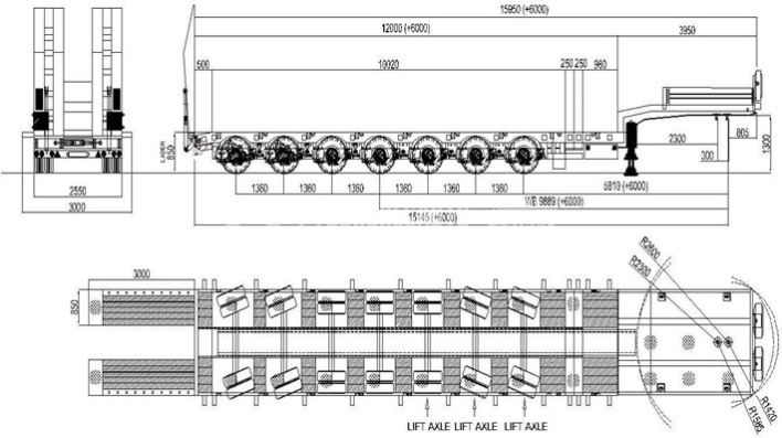 - Полуприцеп низкорамный 7 осный раздвижной KOLUMAN - Г/п по ЭПТС - 88 500 кг - Г/п 102 т тех. нагрузка при 30 км/ч - Длина платформы 12 м + 6 м раздвижение с фиксацией шага 500 мм - 2 рабочих стола по 250 мм - Уширители 225 мм с каждой стороны - 7 осей SAF г/п 12 тон каждая - 1-я, 2-я и 3-я оси подъемные - 1-я, 2-я, 6-я и 7-я оси подруливающие - Нагрузка на ССУ тягача 24 тоны - Под ССУ тягача 1300 мм - Собственная масса 22 тоны - Высота в транспортном положении 850 мм - Карманы для коников (без коников) - 4S 3M Тормозная система WABCO - Рама из стали S355 - Шины 245 / 70 R 17.5 - Аппарели одинарного типа повышенной прочности с гидравлическим приводом L: 3000 мм W: 850 мм (покрытие деревом и металлом) - Механические опоры в районе задней аппарели 2 шт - Опорно-стояночное устройство OMS или аналог с характеристиками: статическая нагрузка 50 тонн, динамическая - 24 тонны - Светотехника 24 В в соответствии с нормами ЕС, ЕС ASPOCK - Противоскользящее покрытие на основной балке - Инструментальный ящик INOX