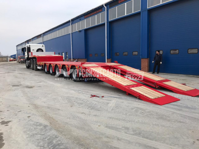 Трал низкорамный Kassbohrer LB5E с 12 градусными гидравлическими аппарелями, г/п 58 700 кг, 5х11 т оси BPW ECO MAXX, собственная масса 15 358 кг, длина платформы 9,2 м + раздвижение 6 метров, уширители, первая ось подъемная, четвертая и пятая оси подруливающие, отверстия под коники